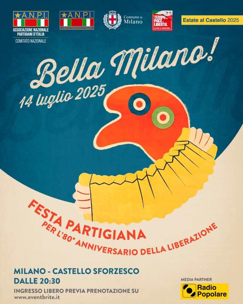 Nell’ambito della rassegna artistica “Estate al Castello 2025”, promossa dal Comune di Milano, il 14 luglio dalle 20.30 al Castello Sforzesco, vi aspettiamo tutti per un concerto Partigiano senza pari. Ci ritroveremo in tante e tanti per ricordare la festa del 14 luglio 1945 per la Liberazione dai nazifascisti, indetta dal sindaco Antonio Greppi (Liberi di cantare e ballare).