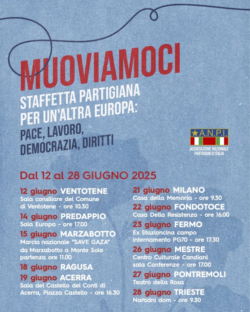 L’Europa che sta prendendo forma giorno dopo giorno, ormai da anni, davanti ai nostri occhi, non è quella che vorremmo. Non è nemmeno lontanamente somigliante a quella disegnata nel Manifesto di Ventotene. Non è un’Europa di pace, libertà, unità, lavoro, eguaglianza sociale: valori nati dalla Resistenza e che ci piacerebbe fossero le basi su cui costruire “l’edificio” europeo. Per tutte queste ragioni l’ANPI lancia dal 12 al 28 giugno una mobilitazione di pressione e informazione diffusa sotto forma di “Staffetta Partigiana” in 10 luoghi simbolo dell’antifascismo, della Lotta Partigiana e della barbarie fascista. Da Ventotene – prima tappa – a Milano, da Fermo a Predappio, da Acerra al “Narodni Dom” di Trieste, la Casa degli Sloveni incendiata nel 1920 dai fascisti.